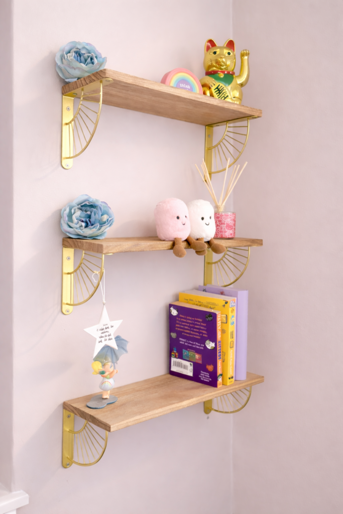 I put these gold fan-shaped shelf brackets up in my daughter’s room and they instantly made the space feel more styled.